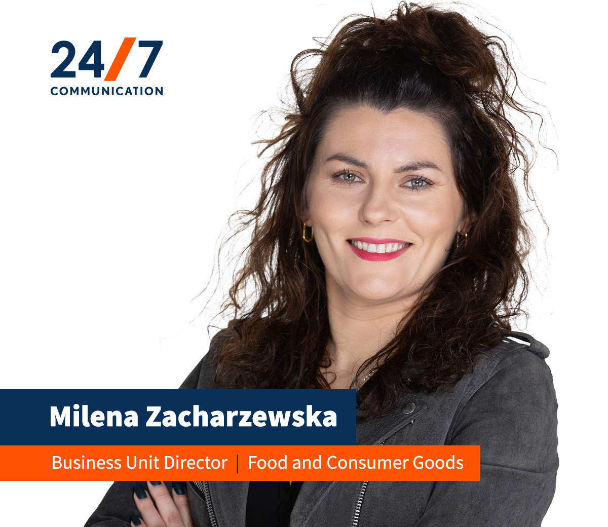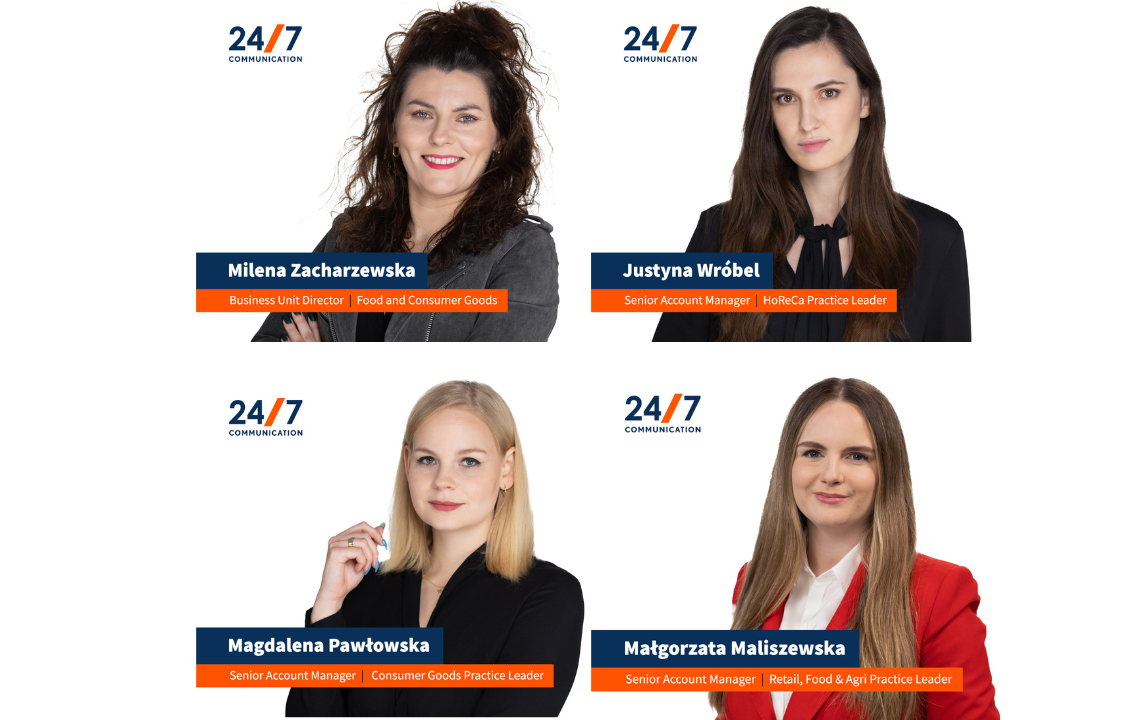 Na czele departamentu Food & Consumer Goods stanęła Milena Zacharzewska, Business Unit Directorka,z ponad 13-letnim doświadczeniem w branży rolno-spożywczej. Od ośmiu lat związana jest z 24/7Communication, jako Senior Account Managerka, Consultantka i Team Liderkaod, a od 2022 roku jako Account Directorka. Zacharzewska jest odpowiedzialna za Business Unit FMCG, w skład którego wchodzą obszary: HoReCa, Food & Agriculture oraz Consumer Goods. Zacharzewska odpowiadała także za PR i doradztwo marketingowe oraz realizację projektów dla firm takich jak McDonald’s Polska, Goodvalley, MOWI czy LOTTE Wedel.