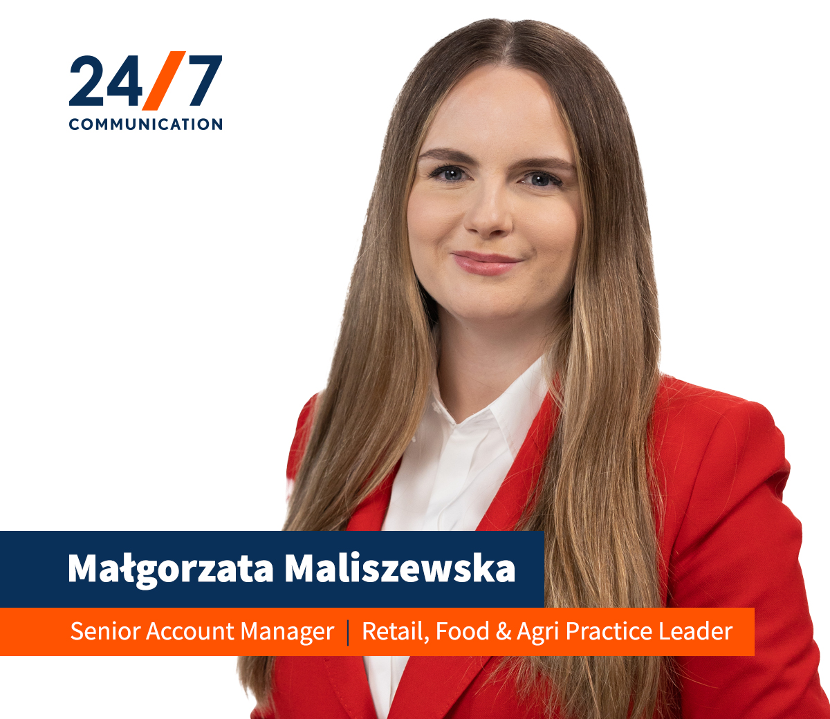 Zespołem Retail, Food & Agri pokieruje Małgorzata Maliszewska, która w marcu 2024 roku dołączyła do24/7Communication. Wspólnie z czteroosobowym zespołem rozwija ona segment ze szczególnym uwzględnieniem komunikacji w sektorze rolno-spożywczym. Do tej pory Maliszewska zajmowała się doradztwem strategicznym i działaniami z zakresu Public Affairs. Specjalizuje się w komunikacji strategicznej, public affairs oraz issue management. Przed dołączeniem do zespołu 24/7 przez dwanaście lat pracowała w firmach doradczych, które specjalizują się w złożonych projektach komunikacyjnych, w tym komunikacji kryzysowej. Ponadto doradzała także firmom z branży energetycznej, surowcowej oraz infrastrukturalnej. Maliszewska jest absolwentką Wydziału Dziennikarstwa i Nauk Politycznych UW. Ukończyła również zarządzanie na Akademii im. Leona Koźmińskiego.