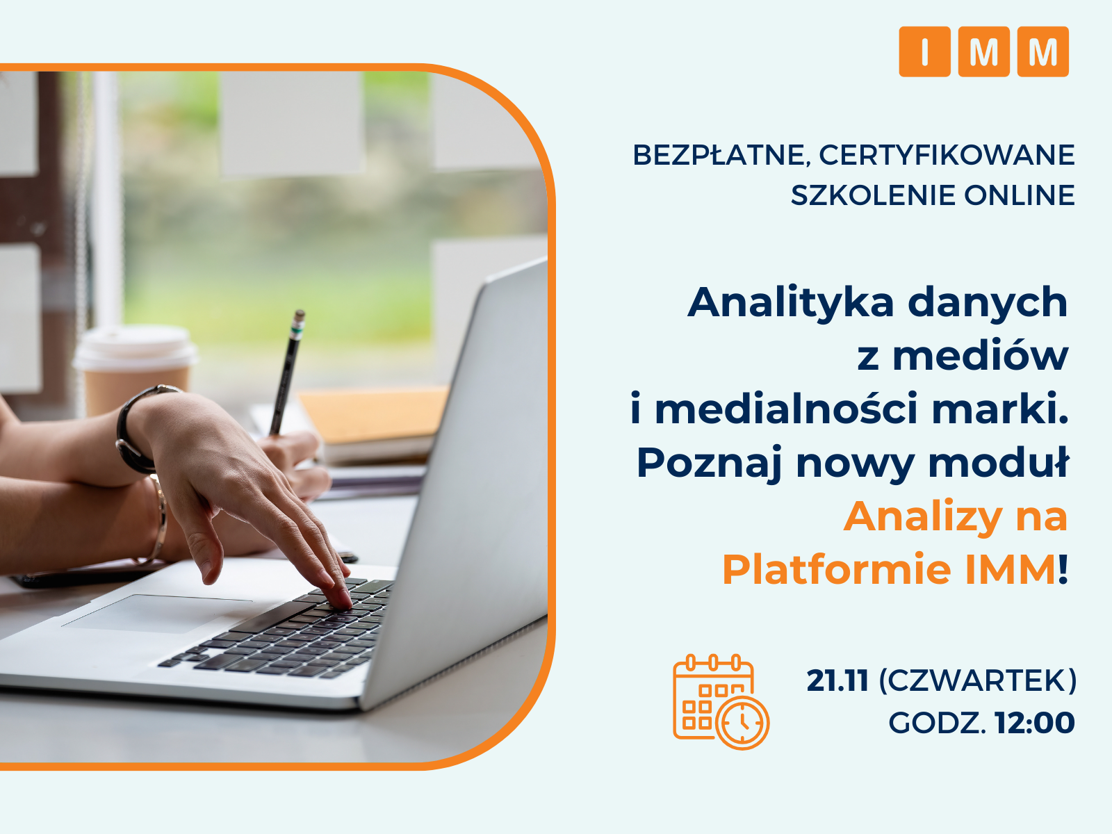 W czwartek 21 listopada 2024 o godzinie 12:00 odbędzie się bezpłatne, certyfikowane szkolenie online zatytułowane „Analityka danych z mediów i medialności marki – nowy moduł Analizy na Platformie IMM”.
