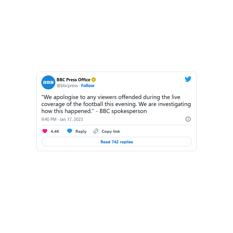 Rzecznik BBC opublikował tweeta z przeprosinami po tym, jak podczas transmisji na żywo z finału Pucharu Anglii można było usłyszeć dźwięki z filmu pornograficznego – informuje theguardian.com.