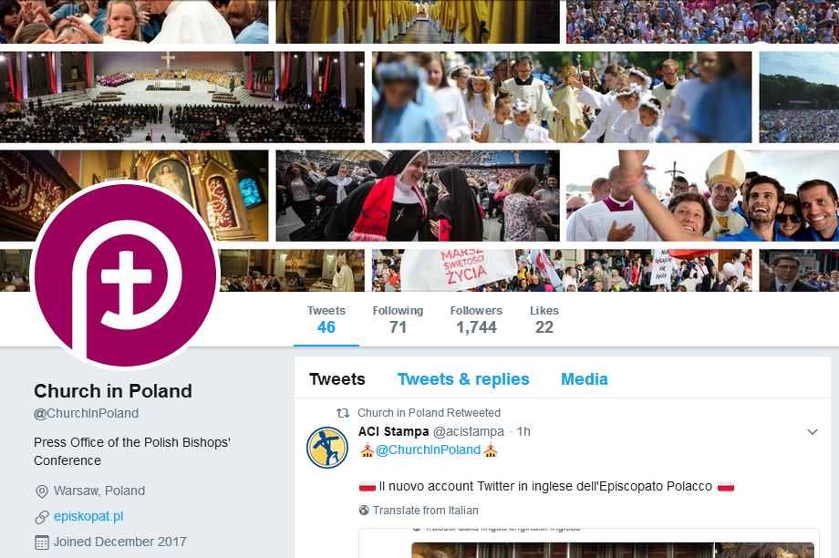 Nowy profil biura prasowego Konferencji Episkopatu Polski na Twitterze funkcjonuje pod nazwą @ChurchInPoland i jest prowadzony w języku angielskim. Pierwszy tweet zamieszczono 12 grudnia 2017 roku. Profil obserwuje obecnie ponad 1,7 tys. użytkowników.