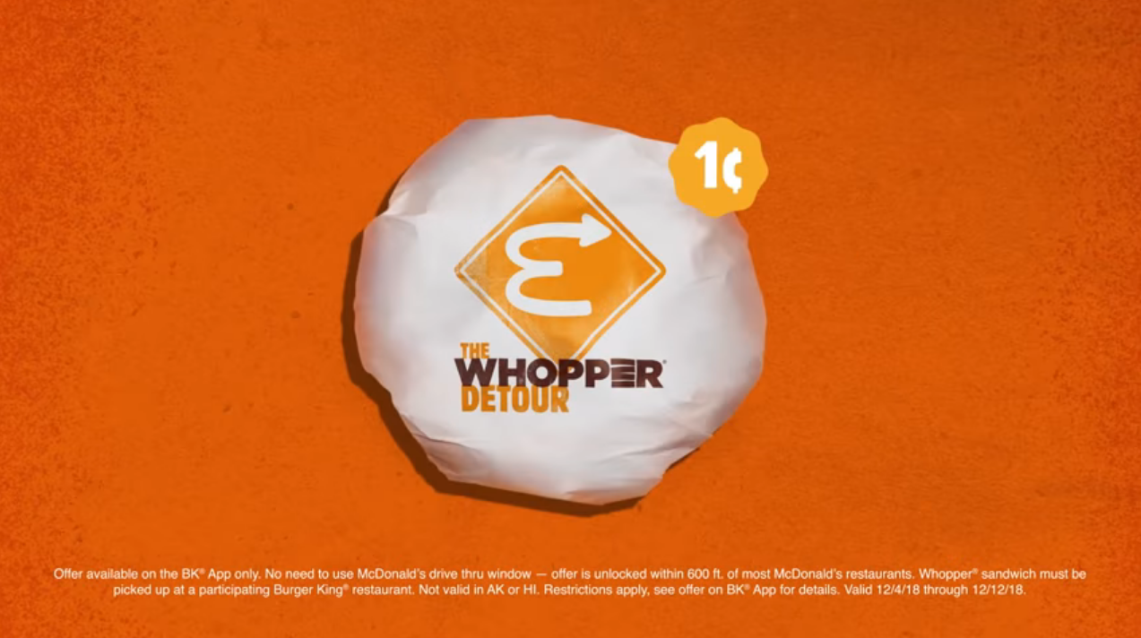 Burger King w Stanach Zjednoczonych promuje swoją aplikację mobilną kampanią „Whooper Detour”. Zachęca w niej klientów, aby zamówili jedną z kanapek, będąc w restauracji McDonald’s lub w jej pobliżu. Mogą wtedy kupić Whoopera za jednego centa – informuje adage.com. Portal opisuje, że osoby, które znajdą się w restauracji konkurencyjnej sieci lub w pobliżu (w odległości nie większej niż 600 stóp, czyli około 183 m), będą mogły dokonać zakupu promocyjnej kanapki i zapłacić za nią przez aplikację, która następnie pokieruje ich do najbliższego lokalu Burger Kinga, gdzie będą mogli odebrać zamówienie.
