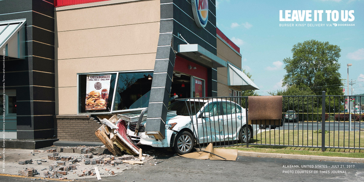 Jak informuje źródło, aby zachęcić klientów do korzystania z opcji dostawy jedzenia, Burger King w swojej najnowszej kampanii pokazuje zdjęcia autentycznych wypadków samochodowych, które wydarzyły się przy jego lokalach. Tym razem na reklamach zamieszczono hasło „Zostaw to nam”, a pod nim wiadomość o możliwości dostarczenia posiłków z menu Burger Kinga zamówionych za pośrednictwem aplikacji DoorDash.