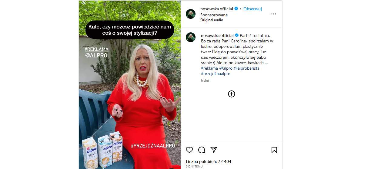 12 lipca 2023 roku influencerka Caroline Derpienski poinformowała o podjęciu kroków prawnych w związku z opublikowaną przez Katarzynę Nosowską na Instagramie satyryczną reklamą produktu marki Alpro, której właścicielem jest Danone.