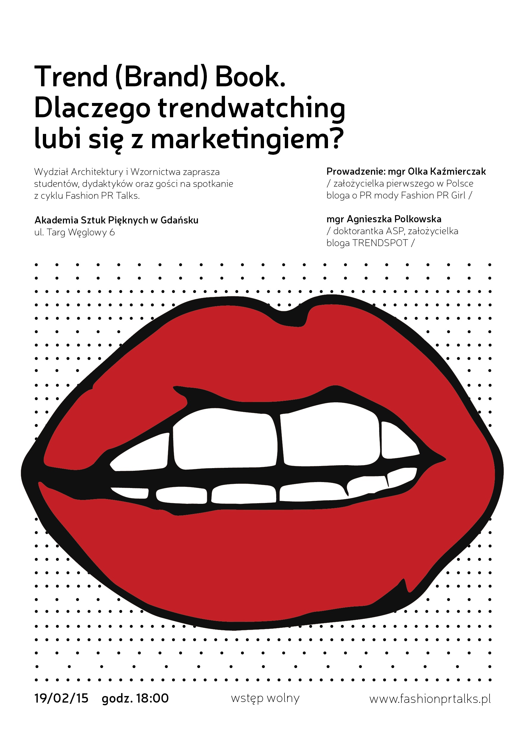 Spotkanie pod tytułem „Trend (Brand) Book. Dlaczego trendwatching lubi się z marketingiem” odbędzie się 19 lutego o godz. 18 na Akademia Sztuk Pięknych Gdańsk, ul. Targ Węglowy 6. Wstęp na spotkanie jest wolny.
