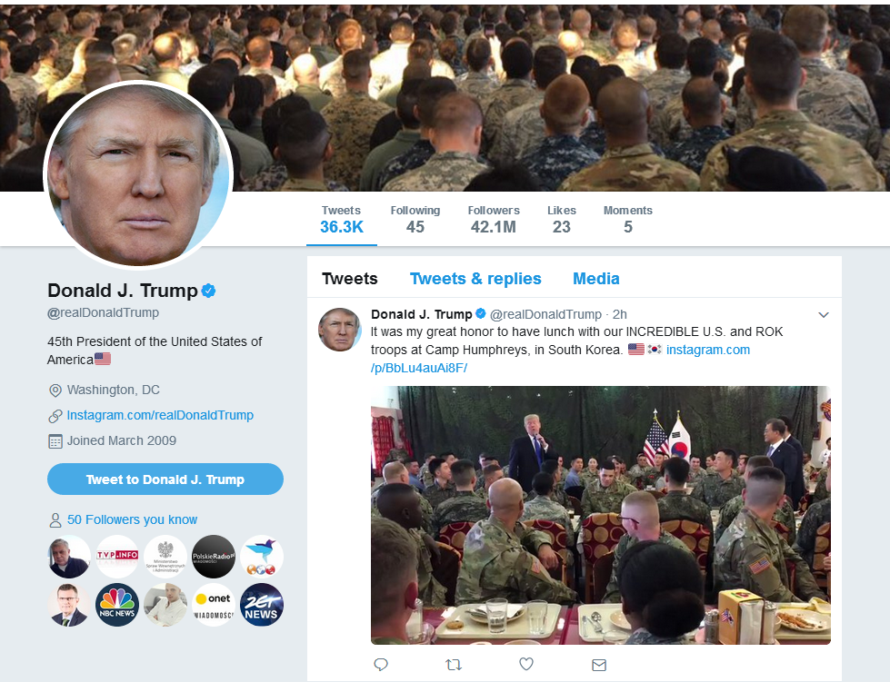 Biały Dom, jak dalej czytamy, w odpowiedzi na zarzuty podkreślił, że konto @realdonaldtrump, którego na co dzień używa Trump, jest jego profilem prywatnym i nie jest to oficjalne konto urzędu Prezydenta USA. (mb)