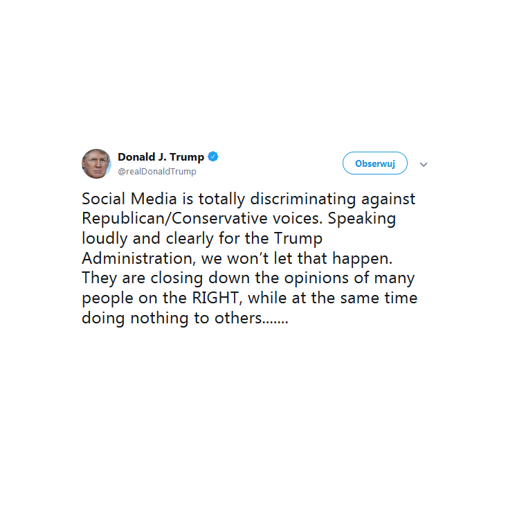 Donald Trump napisał na Twitterze, że media społecznościowe dyskryminują „głosy republikanów i konserwatystów”. Prezydent USA w imieniu całej swojej administracji oznajmił, że „nie pozwoli, aby tak się działo”. Jego zdaniem platformy społecznościowe cenzurują przedstawicieli prawicy, a „nic nie robią z innymi”.