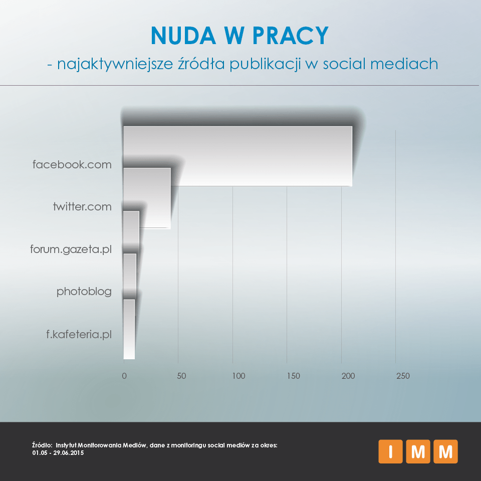 Z badań Instytutu Monitorowania Mediów wynika, że Polacy raczej nie narzekają na brak zajęć zawodowych. Na temat „Nuda w pracy” w social mediach w ciągu dwóch miesięcy pojawiło się zaledwie 400 wzmianek. Z jednej strony może to świadczyć o tym, że cały czas lubimy stawiać przed sobą wyzwania, a z drugiej, że pracodawcy dokładnie realizują działania employer brandingu. Chociaż czas letni może wpłynąć na spadek naszej formy intelektualnej oraz generalny brak chęci do działania, to jednak z ogłaszaniem rozleniwienia podczas godzin pracy lepiej poczekać do 18-stej. Szczere wyznanie, ironiczny podpis i kliknięcie „opublikuj”, „wyślij” czy „udostępnij” na Facebooku, Snapchacie albo Instagramie sprawi, że nasze ‘nudne’ obowiązki możemy zakończyć zdecydowanie szybciej niż myślimy.