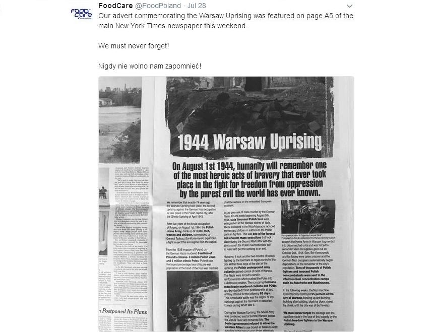 28 lipca 2018 roku, w sobotnim wydaniu The New York Timesa, ukazał się tekst sponsorowany przez polskie przedsiębiorstwo FoodCare na temat Powstania Warszawskiego – pisze portal wiadomosci.onet.pl. Artykuł jest częścią kampanii informacyjnej, której celem jest edukacja na temat polskiej historii na świecie.