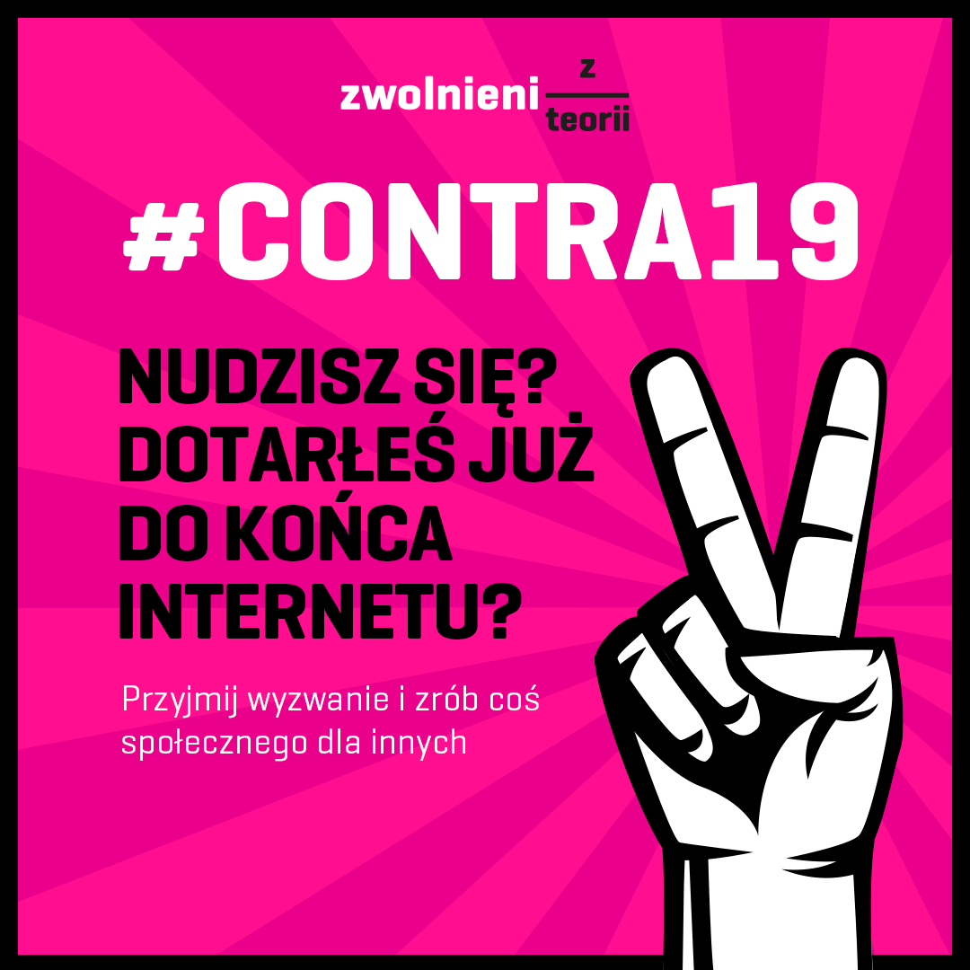 Fundacja Zwolnieni z Teorii zainicjowała akcję #CONTRA19 – w kontrze do COVID-19, której celem jest zachęcenie młodych ludzi do zaangażowania się w pomoc lokalnym przedsiębiorcom, instytucjom kultury czy osobom starszym lub zwalczanie fake newsów. Wszystkie aktywności – w formie wyzwań – nastolatkowie z całej Polski mają oczywiście wykonywać bez wychodzenia z domu.