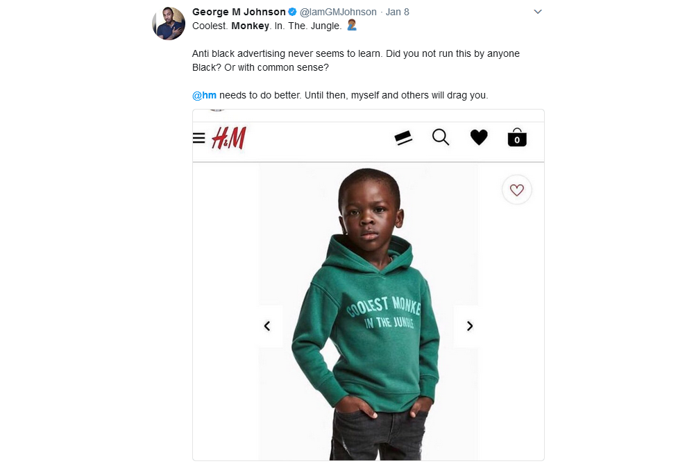 Klienci zarzucają szwedzkiej sieci sklepów odzieżowych H&M rasizm. Wszystko przez zdjęcie prezentujące jeden z produktów marki. Fotografia w sklepie internetowym przedstawiała czarnoskórego chłopca w bluzie z napisem „Najfajniejsza małpa w dżungli” (ang. „The coolest monkey in the jungle”) – opisuje independent.co.uk.