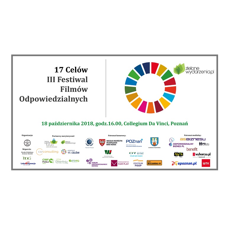 18 października 2018 roku w Poznaniu odbędzie się trzecia edycja Festiwalu Filmów Odpowiedzialnych „17 Celów”. Jak wyjaśnia Fundacja CSR Res Severa, organizator wydarzenia, jest to jedyny w Polsce festiwal filmowy związany ze zrównoważonym rozwojem, społeczną odpowiedzialnością biznesu i Globalnymi Celami ONZ (SDGs).