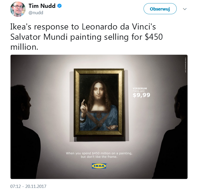 IKEA w zabawny sposób odpowiedziała na sprzedaż najdroższego obrazu świata „Salvator Mundi” („Zbawiciel świata”), który namalował Leonardo da Vinci. W ubiegłym tygodniu obraz został sprzedany na aukcji za rekordową cenę 450 mln dolarów – pisze Tim Nudd na adweek.com.