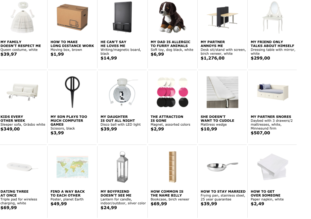 Pomysł na kampanię pojawił się dlatego, że szwedzkie nazwy produktów mogą być trudne do zapisania ze względu na specyficzne twarde samogłoski. Firma przeanalizowała wyniki wyszukiwań w Google i wytypowała najczęściej wybierane przez Szwedów frazy, a następnie opisała nimi część przedmiotów z oferty sklepu. Jak to wypada w praktyce? Użytkownik, który wpisał pytanie: „Ile czasu kąpią się nastolatkowie?” wśród wyników wyszukiwania znajdzie czasomierz marki IKEA. Na ładowarkę do telefonu trafi z kolei pod wymownym hasłem „Nie odpisuje mi na wiadomości” a na duże, wygodne łóżko pod frazą „Jak mieć szczęśliwy związek”.