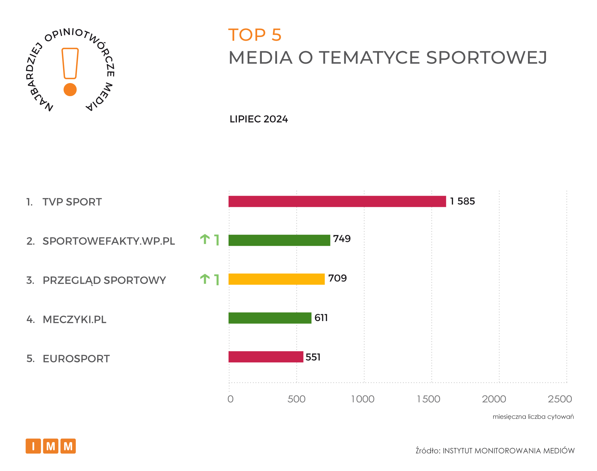 Czołowe miejsce zestawienia mediów o tematyce sportowej zajmuje TVP Sport. Stacja uzyskała blisko 1,7 tys. cytowań. Inne media w lipcu odwoływały się do licznych relacji i komentarzy sportowych podczas Igrzysk Olimpijskich w Paryżu. Drugie miejsce zestawienia zajmują Sportowe Fakty WP z liczbą 749 wzmianek, a podium zamyka Przegląd Sportowy z 709 powołaniami.