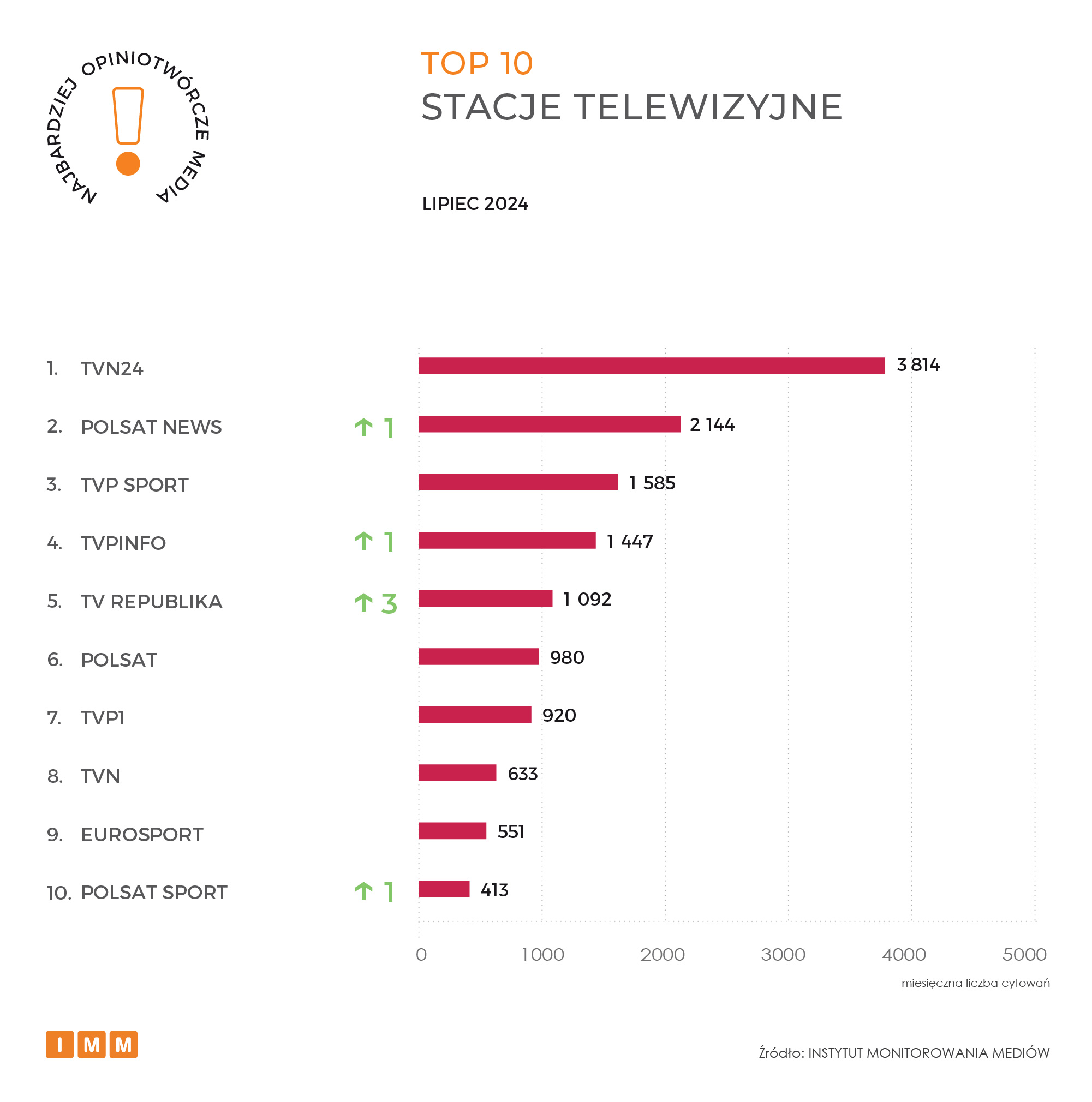 W lipcu pierwsze miejsce w rankingu najbardziej opiniotwórczych stacji telewizyjnych utrzymuje TVN24. Na stację powołano się ponad 3,8 tys. razy. Druga lokata dzięki awansowi o jedną pozycję należy do Polsat News. Stację cytowano ponad 2,1 tys. razy m.in. za sprawą rozmowy z Andrzejem Dudą w „Gościu Wydarzeń”. Prezydent odniósł się podczas wywiadu do słów Donalda Tuska, który miał zarzucić mu wykorzystanie szczytu NATO w Waszyngtonie do dezinformowania opinii publicznej. Andrzej Duda stwierdził w wywiadzie, że widzi „ogromną nerwowość” u premiera. Trzecie miejsce z liczbą blisko 1,6 tys. wzmianek odnotowuje stacja TVP Sport.