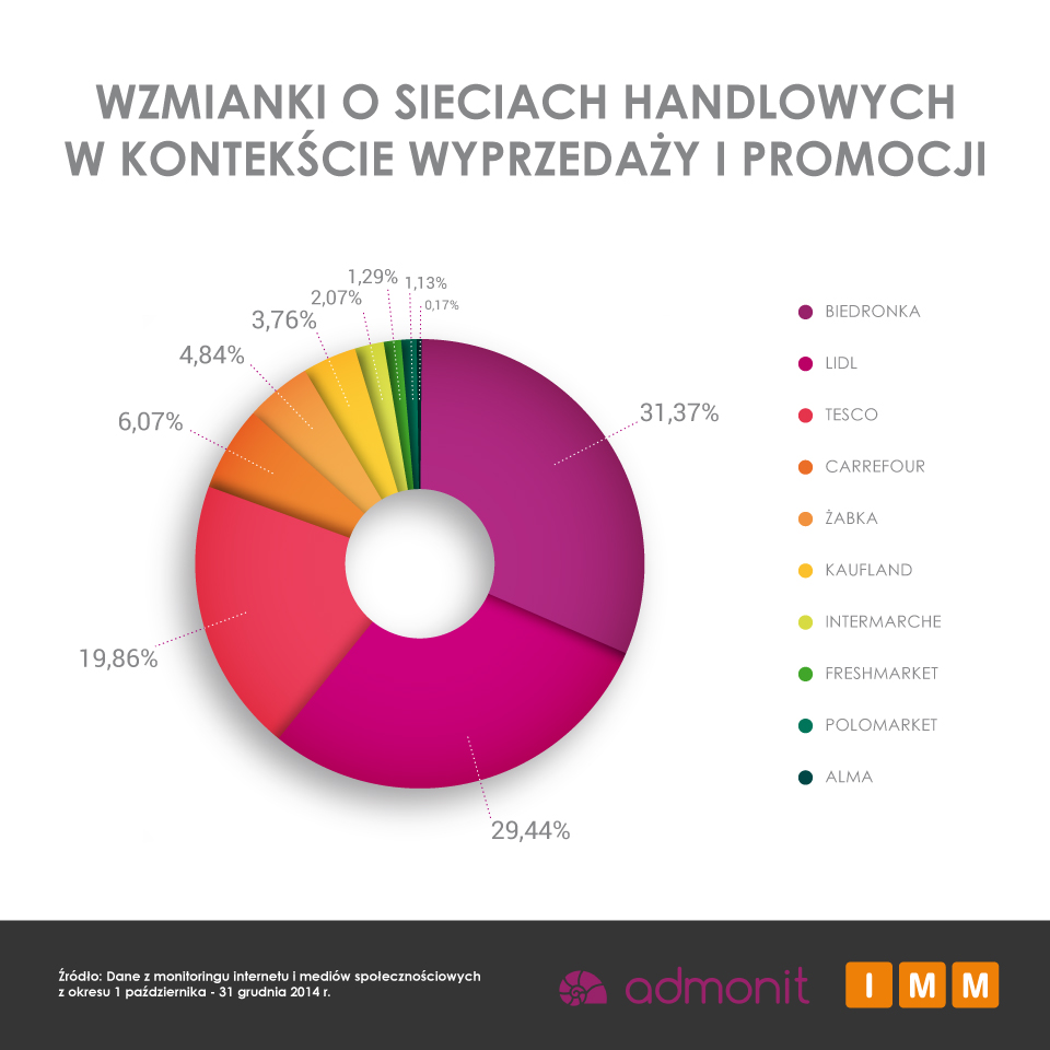 Zbiorczy monitoring reklam, mediów tradycyjnych, internetu i mediów społecznościowych na Platformie IMM wskazuje, że w czwartym kwartale 2014 roku wysokość środków przeznaczanych na reklamy sieci handlowych szła w parze z zainteresowaniem mediów i internautów promowanymi markami. W badanym okresie dziennikarze w mediach tradycyjnych najwięcej publikacji poświęcili Lidlowi (blisko 3,4 tys. publikacji, z czego 3,2 tys. w prasie, ponad 100 w radiu i 18 w stacjach telewizyjnych). Biedronka pojawiła się w publikacjach medialnych 1,4 tys. razy, a Tesco – ponad 1 tys.