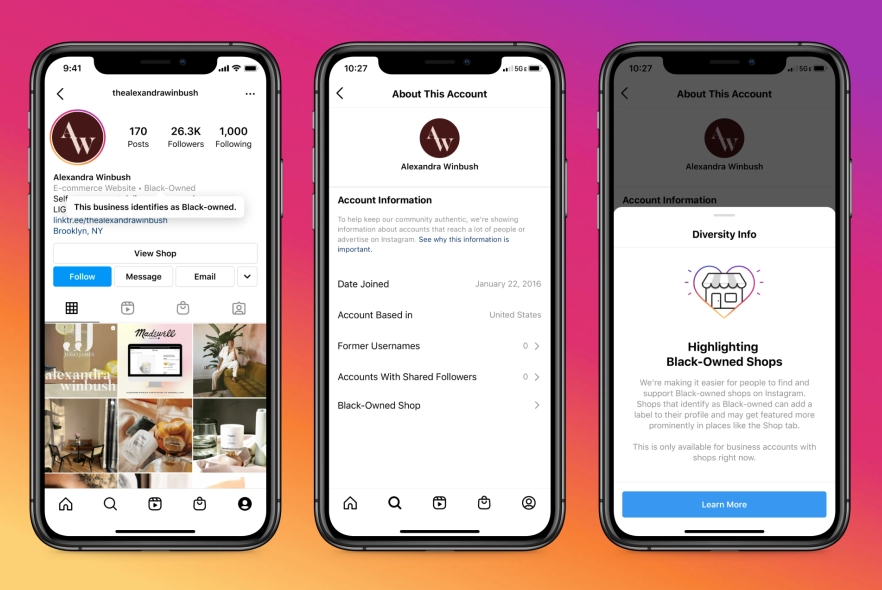 „Słyszeliśmy od naszej społeczności, że oprócz okazywania miłości swoim ulubionym firmom należącym do osób czarnoskórych, chętnie odkrywają ich więcej. Jeśli mieszkasz w Stanach Zjednoczonych, zobaczysz etykietę »należący do osób czarnoskórych« na profilu i odpowiednich stronach produktów dowolnej kwalifikującej się firmy, która sama wskazała” – wyjaśniają Divya Kunapuli, Product Marketing Manager, i Rachel Brooks, Product Manager, Equity w Instagramie.