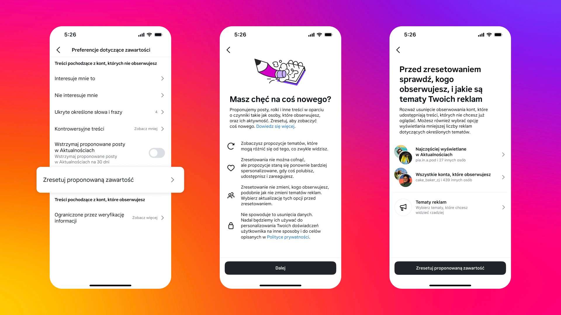 Teraz serwis testuje opcję resetowania rekomendacji treści. „Za pomocą kilku kliknięć będzie można wyczyścić rekomendowane treści w sekcjach Eksploruj, Reelsach i w Aktualnościach i zacząć od nowa” – poinformowano.