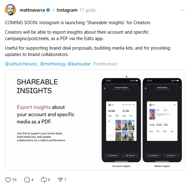 Matt Navarra, ekspert ds. mediów społecznościowych, w serwisie Threads udostępnił przykładowe działanie nowej funkcji. Zgodnie ze wskazówkami Navarry, uproszczone podsumowanie danych dotyczących konta i wyników publikowanych treści będzie można pobierać w formacie PDF za pośrednictwem należącej do Mety aplikacji Edits.