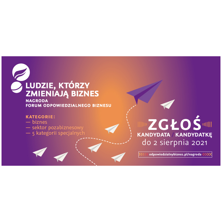 Do czwartku 5 sierpnia 2021 roku przedłużono nabór kandydatur do nagrody „Ludzie, którzy zmieniają biznes”, przyznawanej przez Forum Odpowiedzialnego Biznesu. W konkursie wyróżniane są osoby, które przez swoje zaangażowanie i realizowane projekty przyczyniają się do popularyzacji rozwiązań z zakresu CSR-u i zrównoważonego rozwoju.