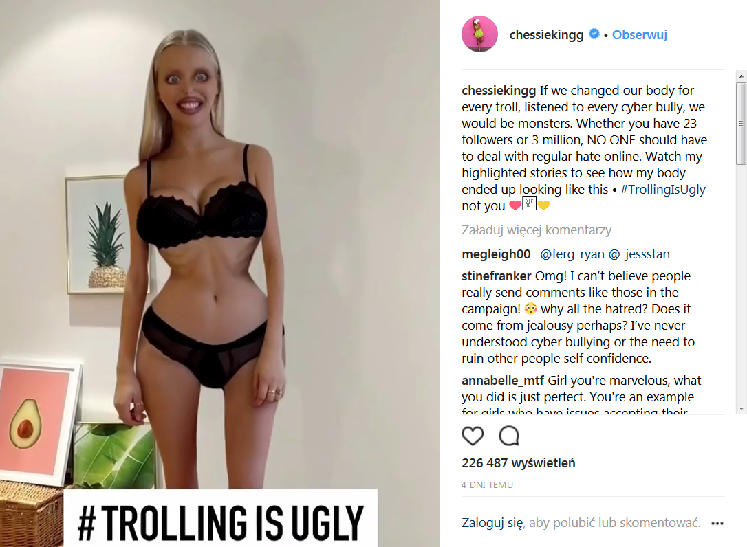 „Gdybyśmy zmieniali nasze ciało dla wszystkich internetowych trolli, bylibyśmy potworami. Niezależnie od tego, czy mamy 23 obserwujących, czy 3 miliony, NIKT z nas nie powinien mieć do czynienia z regularnym hejtem w sieci” – napisała na swoim profilu na Instagramie Chessie King. „#TrollingJestBrzydki, nie Ty” (ang. #TrollingIsUgly, not you) – dodała influencerka.