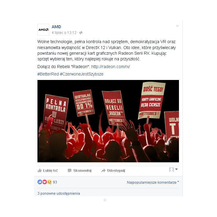 AMD, specjalizujące się w produkcji elektroniki, na swoim profilu na Facebooku opublikowało post promujący produkty firmy – karty graficzne. „Dołącz do Rebelii” – zachęca we wpisie AMD. Tekstowi towarzyszy równiez obraz.