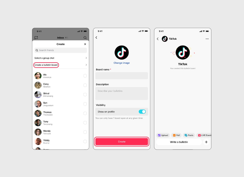W listopadzie 2025 roku TikTok ogłosił uruchomienie funkcji „bulletin board”, która ma ułatwić twórcom komunikowanie się ze swoimi obserwatorami oraz bezpośrednie udostępnianie im treści. Serwis podkreśla, że jest to kanał nadawczy typu one-to-many, umożliwiający szybkie i proste dzielenie się aktualnościami, ogłoszeniami czy ekskluzywnymi materiałami, a także budowanie aktywnych społeczności w aplikacji.