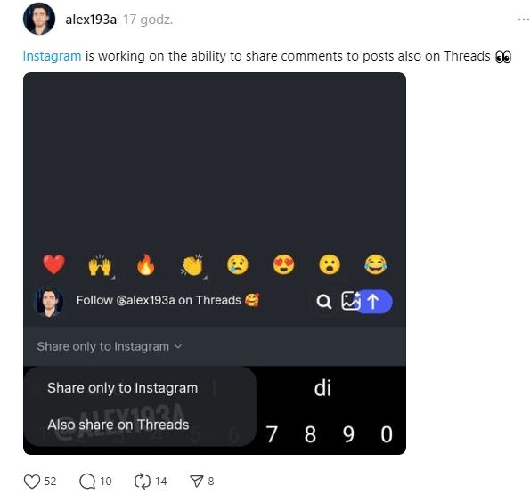Jak czytamy, możliwe, że już wkrótce podczas komentowania posta na Instagramie pojawi się do wyboru opcja, która pozwoli użytkownikom udostępnić swój komentarz także w wątkach na platformie Threads.