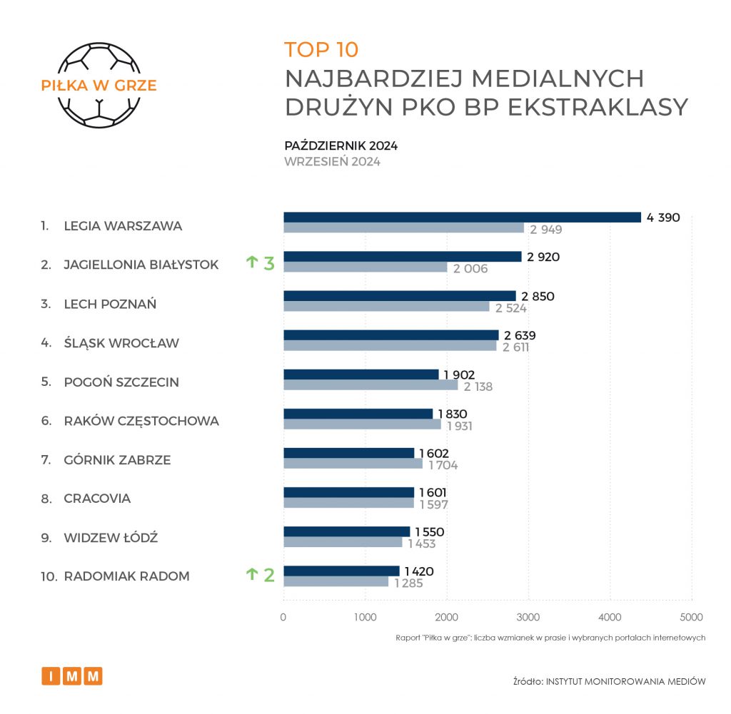 W pierwszy weekend października zmierzyły się ze sobą czołowe drużyny naszego zestawienia. Jagiellonia Białystok zremisowała u siebie z Legią Warszawa 1:1. Lider ligi − Lech Poznań − rozpoczął miesiąc niespodziewaną porażką z Motorem Lublin, lecz dzięki zwycięstwom w kolejnych meczach utrzymał się na pierwszej pozycji w tabeli PKO BP Ekstraklasy. Klub z ul. Bułgarskiej pokonał w wyjazdowym spotkaniu Cracovię, a następnie zdobył komplet punktów przed swoją publicznością w starciu z Radomiakiem Radom. Pogarsza się sytuacja boiskowa Śląska Wrocław. Drużyna z Dolnego Śląska w obecnym sezonie wygrała tylko jeden mecz spośród trzynastu rozegranych − to najgorszy rezultat w lidze. W social mediach kibice domagają się podjęcia natychmiastowych działań w celu poprawy piłkarskiej postawy. Z kolei dla Jagielloni październik był naprawdę udanym miesiącem. Rozpoczął się od niesamowicie ważnego wyjazdowego zwycięstwa z uznaną w Europie FC Kopenhagą, a następnie drużyna z Białegostoku pewnie pokonała mołdawski Petrocub 2:0. Podopieczni Adriana Siemieńca zanotowali ponadto dwa zwycięstwa w lidze i zapewnili sobie kolejną rundę Pucharu Polski dzięki wygranej nad Chojniczanką 3:0. Duma Podlasia zebrała sporo pozytywnych opinii w ubiegłym miesiącu, a internetowe portale sportowe podkreślają imponujący wzrost formy piłkarzy w ostatnim czasie.