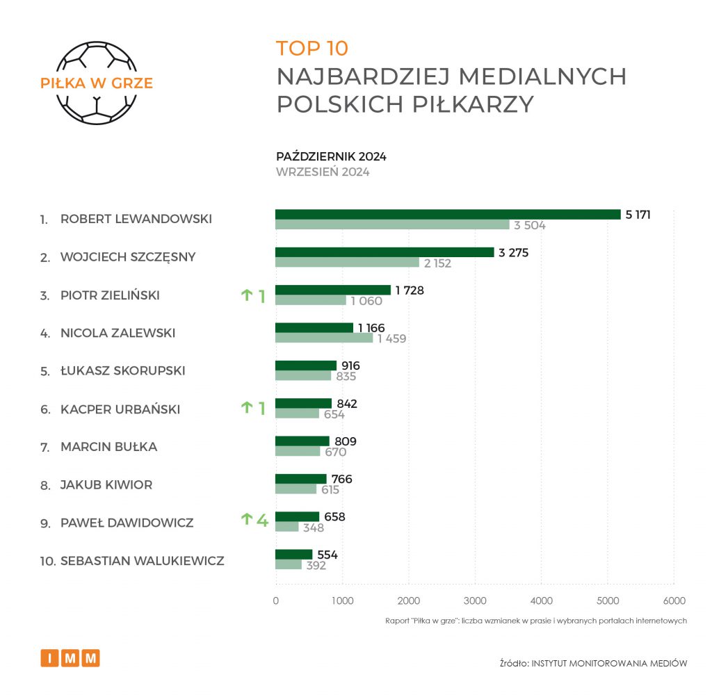 Czołowe drużyny przygotowanego przez Instytut Monitorowania Mediów zestawienia w zdecydowanej większości zaliczyły bardzo udany miesiąc. Nasi przedstawiciele w klubowej Europie są w znakomitej formie piłkarskiej, co przełożyło się na równie wysoki wynik medialny. Robert Lewandowski zdobył dziesięć bramek w pięciu meczach FC Barcelony, co dziennikarze zgodnie oceniają jako niespodziewanie wysoką formę naszego napastnika.