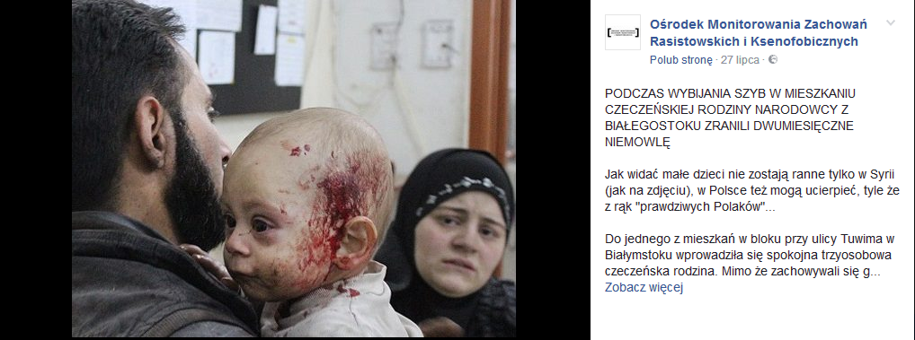 Ośrodek Monitorowania Zachowań Rasistowskich i Ksenofobicznych na swojej facebookowej stronie opublikował w zeszłym tygodniu post, w którym zamieścił historię niemowlęcia zranionego przez narodowców z Białegostoku. Podczas wybijania szyb w domu czeczeńskiej rodziny, mieli oni zranić dwumiesięczne dziecko. Portal natemat.pl zwraca jednak uwagę, że historia i dodane do niej zdjęcie są manipulacją.