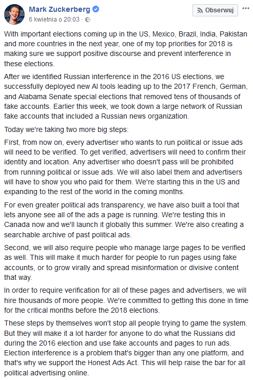 Jak przypomina źródło, dwa lata temu Zuckerberg przekazał, że choć uznaje negowanie Holocaustu za „głęboko obraźliwe”, to nie uważa, aby treści tego typu zasługiwały na usunięcie. CEO Facebooka tłumaczył to omylnością ludzi i wskazywał, że jego zdaniem te osoby nie głoszą niewłaściwych poglądów z premedytacją. Czytamy, że Zuckerberg próbował później wyjaśnić swoje stanowisko w tej sprawie, wskazując, że serwis będzie ograniczać rozprzestrzenianie się tego typu postów i zmniejszać ich wpływ na użytkowników.