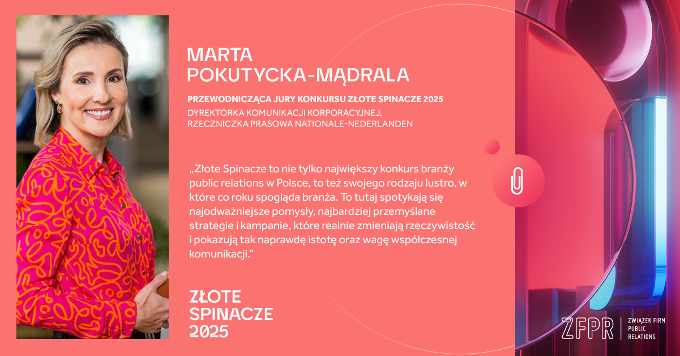 „Złote Spinacze to nie tylko największy konkurs branży public relations w Polsce, to też swojego rodzaju lustro, w które co roku spogląda branża. To tutaj spotykają się najodważniejsze pomysły, najbardziej przemyślane strategie i kampanie, które realnie zmieniają rzeczywistość i pokazują tak naprawdę istotę oraz wagę współczesnej komunikacji” – mówi Marta Pokutycka-Mądrala, przewodnicząca Jury 23. edycji konkursu Złote Spinacze.
