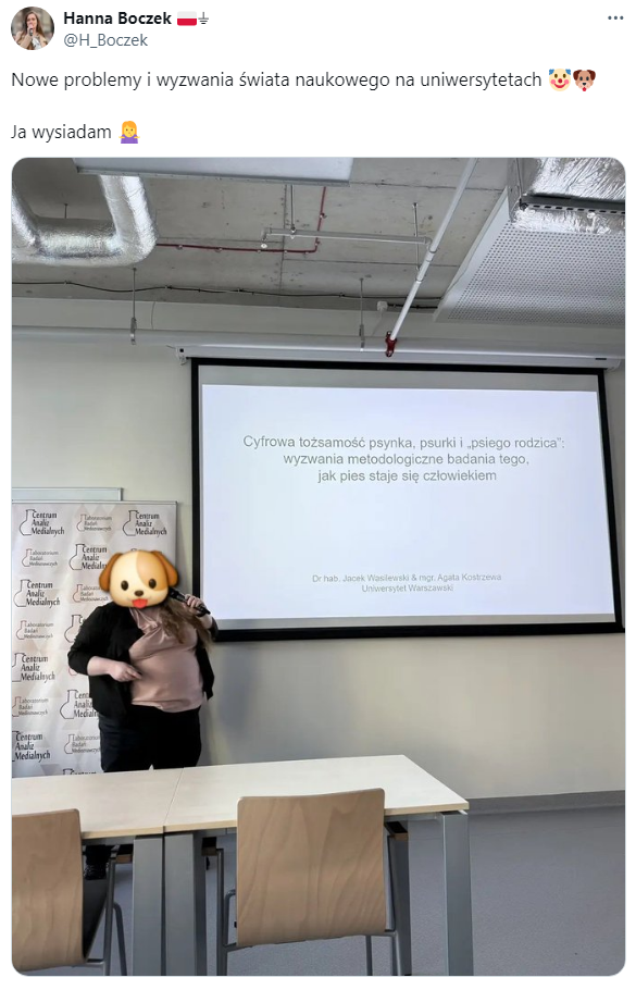 W sieci pojawiło się zdjęcie przedstawiające wystąpienie badaczki z Uniwersytetu Warszawskiego. Na fotografii widoczny jest tytuł prezentacji „Cyfrowa tożsamość psynka, psurki i »psiego rodzica«: wyzwania metodologiczne badania tego, jak pies staje się człowiekiem”. Wywołała ona ogromne poruszenie oraz falę krytyki i hejtu m.in. ze strony polityków należących do Konfederacji. Znajdująca się na zdjęciu Agata Kostrzewa, badaczka i medioznawczyni, opublikowała oświadczenie, w którym podkreśliła, że „w komentarzach przyrównywano ją do świń, negowano jej zdrowie psychiczne i zdolności intelektualne i sugerowano, że zjada psy”.