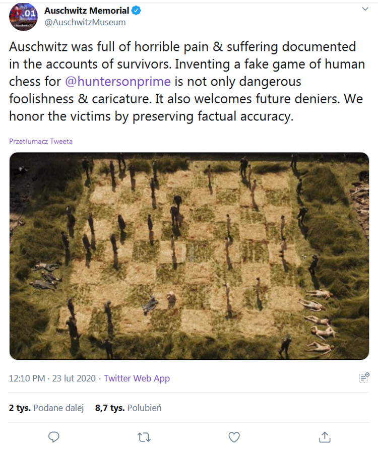 Jak informuje nypost.com, w jednym z ostatnich odcinków serialu „Hunters”, produkowanym przez Amazon Prime, pojawiła się scena, która zdaniem muzeum zakłamuje prawdziwy obraz Holocaustu. W produkcji pokazano nazistów, którzy grają w „żywe szachy” – gra toczyła się na dużej szachownicy przy „użyciu” więźniów przebranych za pionki; kolejne osoby ginęły przy „zbiciu” z szachownicy.