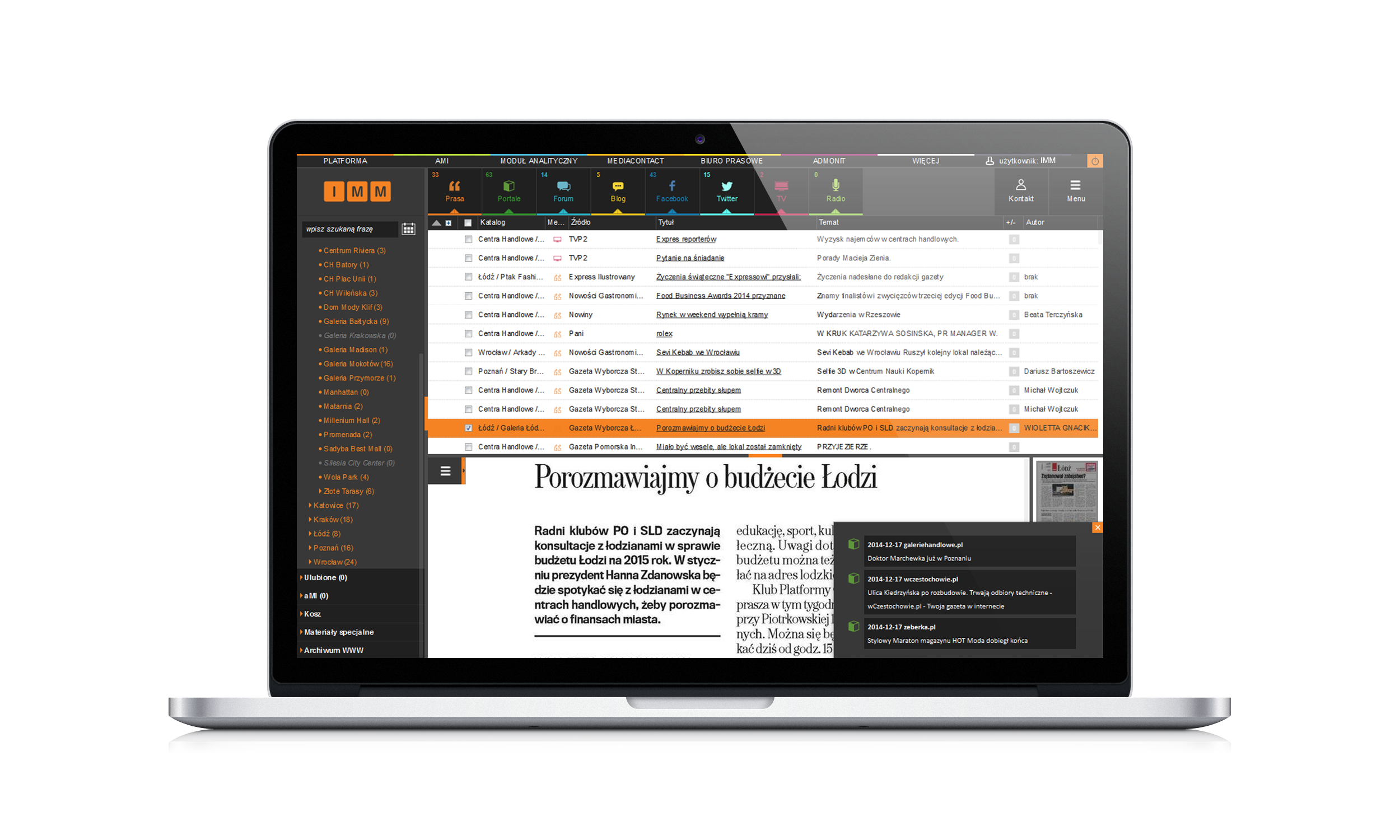Sposób funkcjonowania rynku medialnego charakteryzuje się między innymi szybkim tempem aktualizacji przekazywanych informacji, a współczesna komunikacja wymaga jeszcze szybszej reakcji. Taki model działania wspiera aktualizacja danych na Platformie Instytutu Monitorowania Mediów w czasie rzeczywistym – 24 godziny na dobę, 7 dni w tygodniu. Niezależnie od zakresu monitoringu, wszystkie publikacje umieszczane są na Platformie IMM najszybciej, jak to możliwe. Funkcja ta jest przydatna między innymi dla marketerów, którzy mogą skorzystać z monitoringu mediów, by niemal natychmiast dotrzeć do potencjalnego klienta, np. na forum czy blogu, na którym użytkownik wyraża swoją opinię lub potrzebę znalezienia danego produktu czy usługi. Jak wynika z ostatniej analizy IMM na temat poszukiwania pomysłu na świąteczny prezent przez internautów, aż 70,7 proc. wpisów na ten temat pochodziło z forów internetowych, a 29,3 proc. z blogów. Do głównej trójki mediów społecznościowych, które najczęściej wybierali internauci debatujący ogólnie o prezentach, trafiły kolejno: Facebook, Twitter i Google Plus. Tego typu wiedza na temat każdej dowolnej dziedziny, w której ważne jest odpowiednie lokalizowanie grupy docelowej, może zostać włączona do budowania strategii kontaktu z potencjalnymi klientami w każdej firmie.