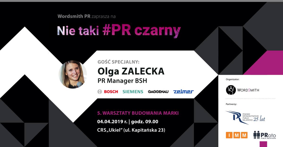4 kwietnia 2019 roku w Olsztynie odbędzie się piąte spotkanie z cyklu „Nie taki #PR czarny”. Gościem specjalnym wydarzenia będzie Olga Zalecka, PR Manager BSH, która odpowiada za wizerunek marek takich jak Bosch, Siemens, Zelmer i Gaggenau.