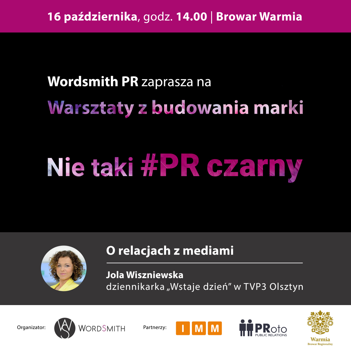 16 października 2018 roku w Olsztynie odbędzie się pierwsze spotkanie z cyklu „Nie taki #PR czarny”. Wydarzenie będzie miało formę warsztatów i skierowane będzie do przedsiębiorców, marketerów, a także wszystkich osób, które chcą dowiedzieć się, jak rozwinąć swoją firmę i zbudować silną markę.