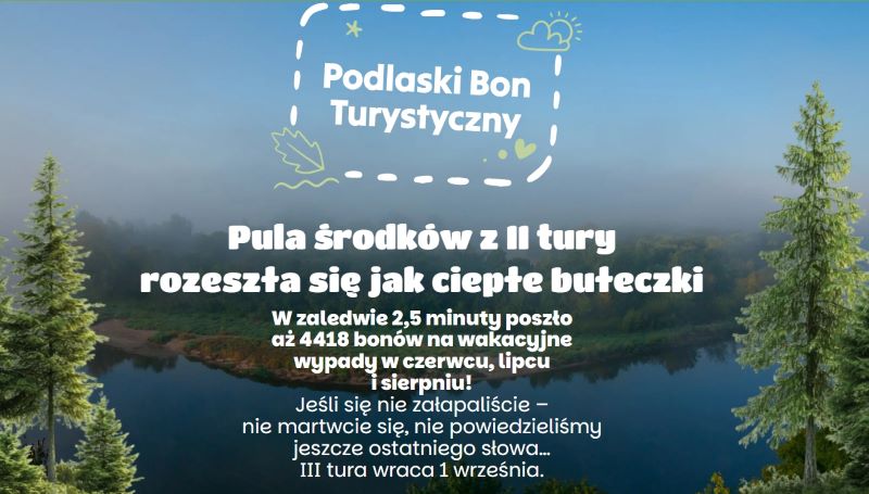 Z uwagi na ogromne zainteresowanie programem samorząd województwa podlaskiego zdecydował niedawno o zwiększeniu budżetu przeznaczonego na dofinansowanie noclegów z 2 do 4 mln zł. Zgodnie z zapowiedzią organizatorów wraz z początkiem czerwca ruszyła druga tura programu, podczas której można uzyskać dofinansowanie na pobyt na Podlasiu w czerwcu, lipcu i sierpniu. Tym razem do rozdysponowania było 1,5 mln zł. W teorii drugi etap generowania bonów miał potrwać do końca sierpnia, jednak cała pula – a więc w sumie 4418 bonów – rozeszła się w zaledwie… dwie i pół minuty – czytamy.