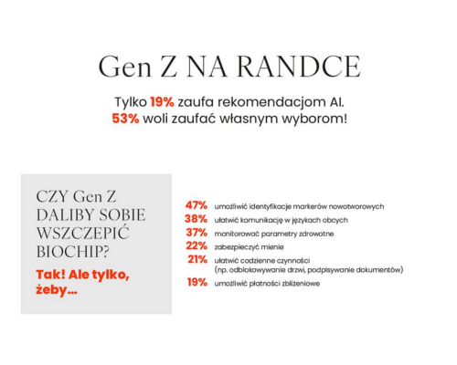 Pomimo wizerunku pokolenia, które bezkrytycznie patrzy na technologię, osoby z generacji Z nie są wielkimi fanami AI, jak początkowo mogłoby się wydawać. Nic więc dziwnego, że biochipy nie znalazły wśród nich zbyt wielu zwolenników. Nieodpłatne wszczepienie takiego urządzenia respondenci uznają za interesujące tylko w wybranych obszarach życia, np. kiedy umożliwiłoby identyfikowanie markerów nowotworowych (47 proc.), monitorowanie parametrów zdrowotnych (37 proc.) lub gdyby dzięki temu zabiegowi mogli łatwiej komunikować się w językach obcych (38 proc.).