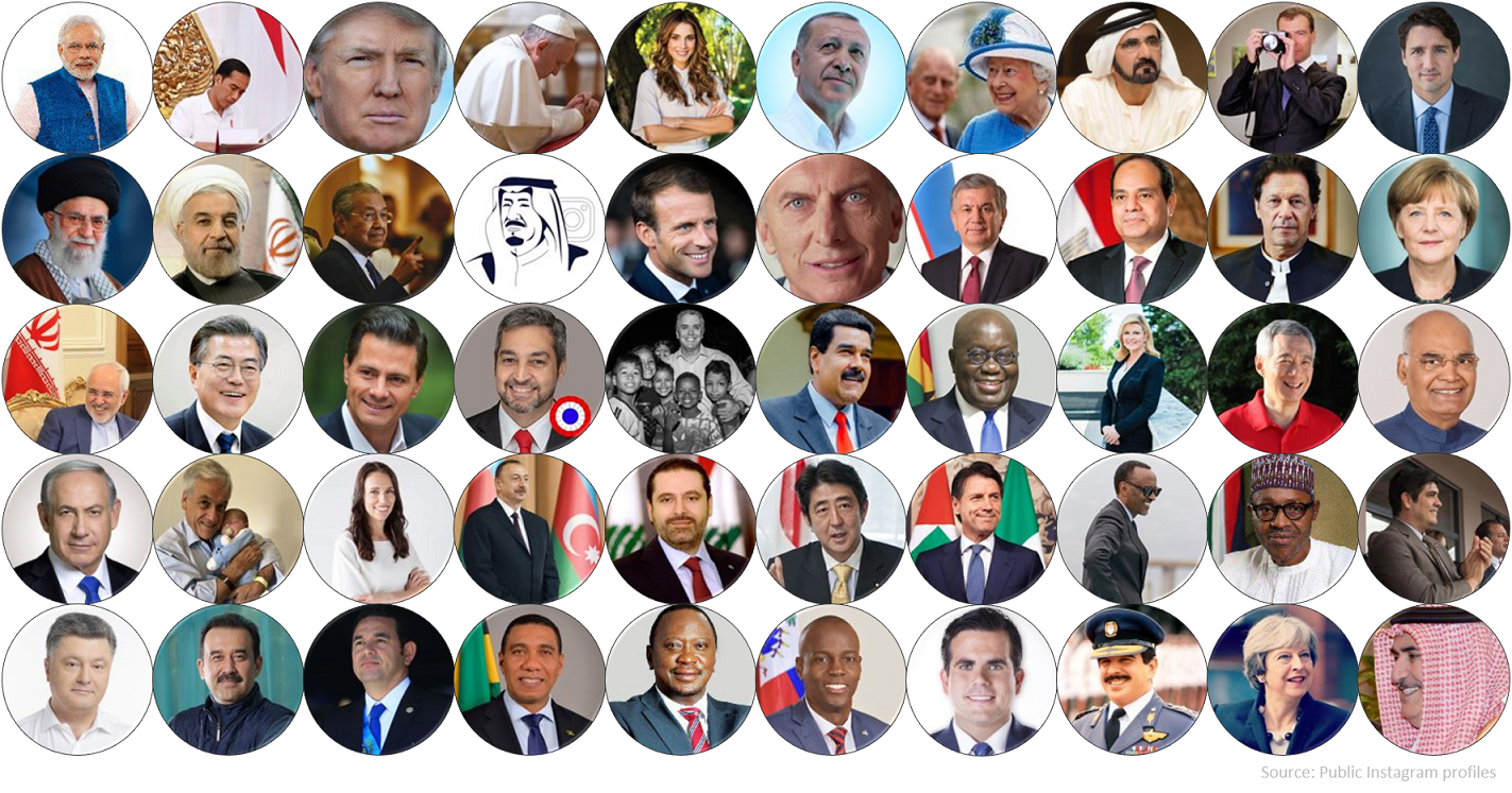 Najczęściej obserwowanym światowym przywódcą na Instagramie jest premier Indii Narendra Modi. Jego profil ma 14,8 mln obserwujących. Za nim w zestawieniu znalazł się indonezyjski prezydent Joko Widodo, posiadający 12,2 mln obserwujących. Trzecie miejsce pod względem liczby obserwujących zajmuje prezydent Stanów Zjednoczonych Donald Trump – śledzi go 10 mln osób. Czwarte miejsce zajął papież Franiszek z 5,7 mln obserwatorów, a piąte – Królowa Jordanii Rania, którą śledzi 4,8 mln osób.