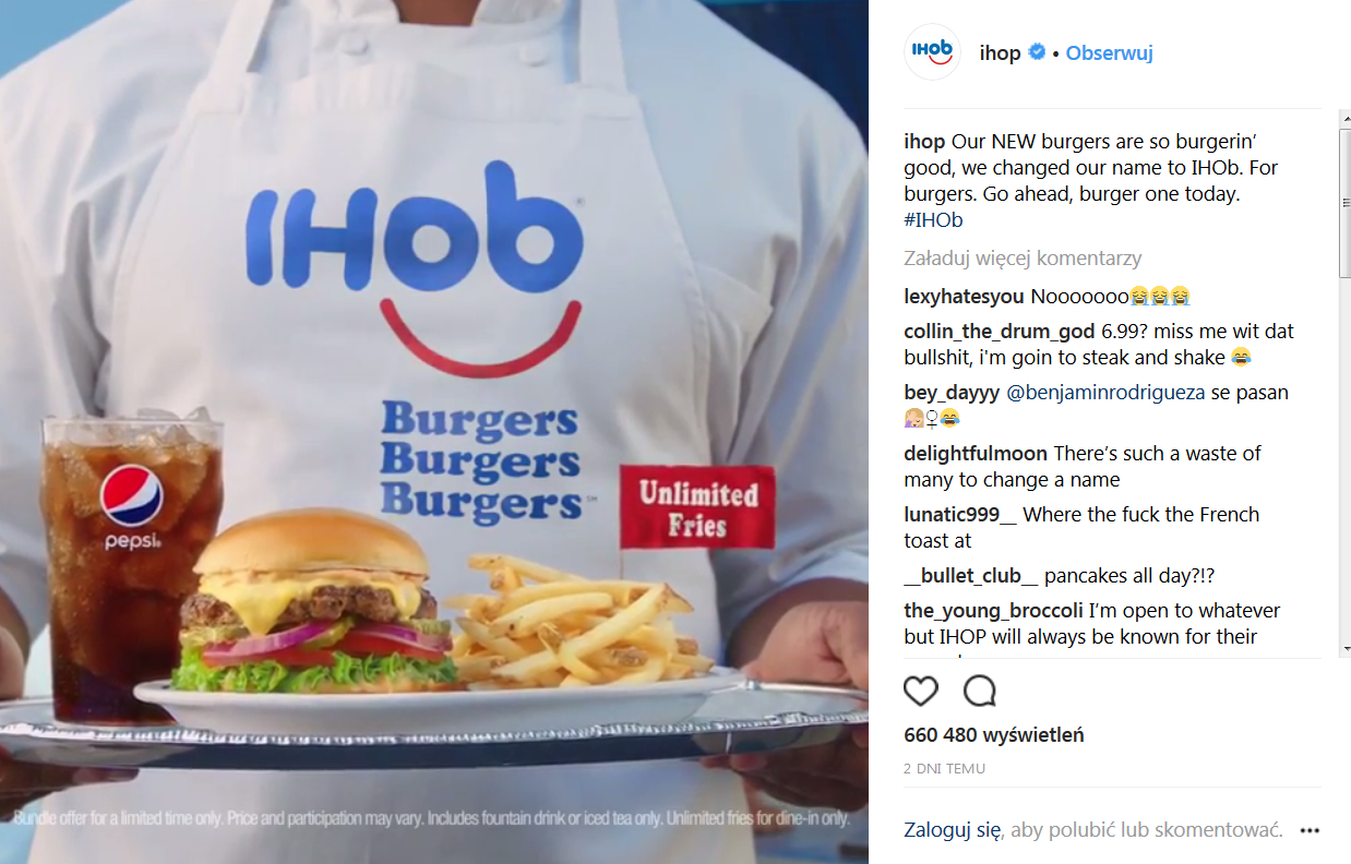 IHOP (International House of Pancakes – przyp. red.), sieć restauracji, która słynie ze sprzedaży naleśników, w związku z wprowadzeniem nowej linii burgerów ogłosiła, że zmienia nazwę na IHOb (International House of Burgers – przyp. red.). Jak pisze w serwisie thisisinsider.com Josh Barro, jest to dobry zabieg marketingowy ze strony marki, dzięki któremu zwróciła ona uwagę na nowe produkty w swojej ofercie.