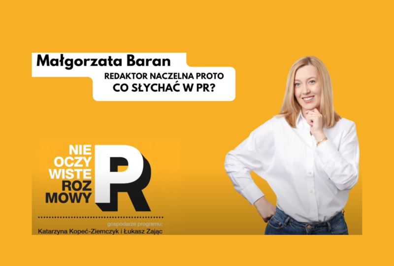 Ukazał się kolejny odcinek branżowego podcastu „Nieoczywiste Rozmowy o PR” prowadzonego przez Katarzynę Kopeć-Ziemczyk i Łukasza Zająca. Tym razem gościnią podcastu była Małgorzata Baran, redaktorka naczelna PRoto.pl, która podzieliła się swoim spojrzeniem na branżę PR.