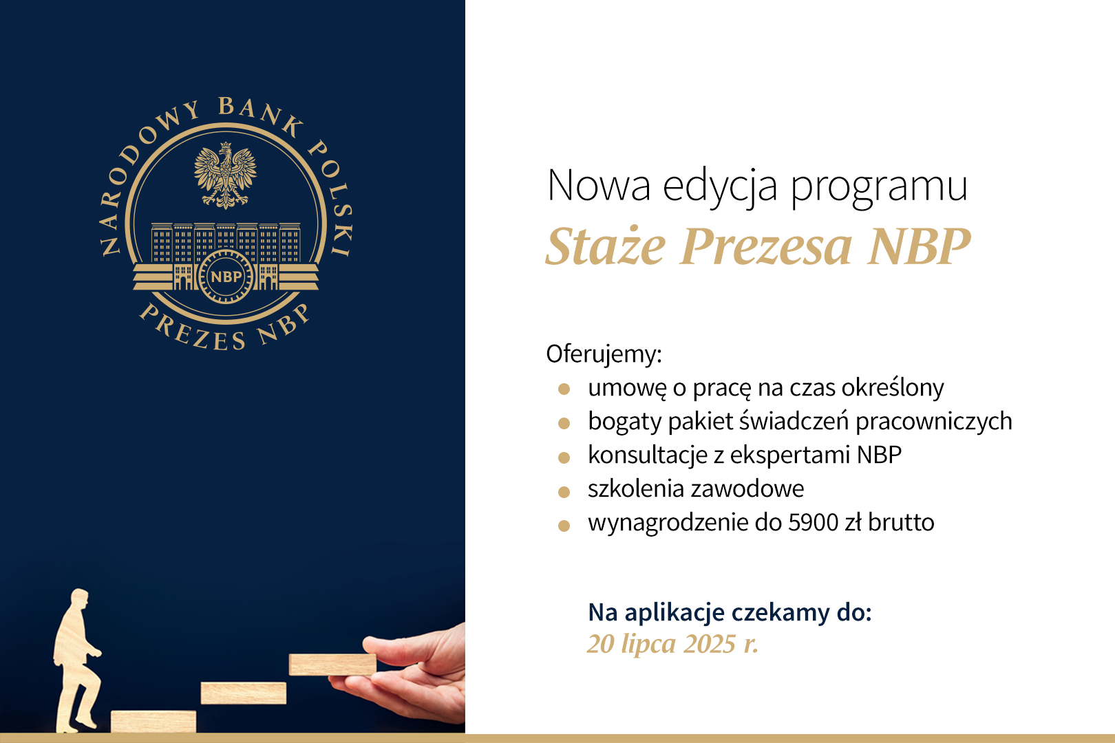 Narodowy Bank Polski rozpoczął nową edycję programu „Staże Prezesa NBP” realizowanego w Centrali i Oddziałach Okręgowych NBP. Prezes Narodowego Banku Polskiego zaprasza do udziału absolwentów uczelni wyższych. Zgłoszenia są przyjmowane do 20 lipca.