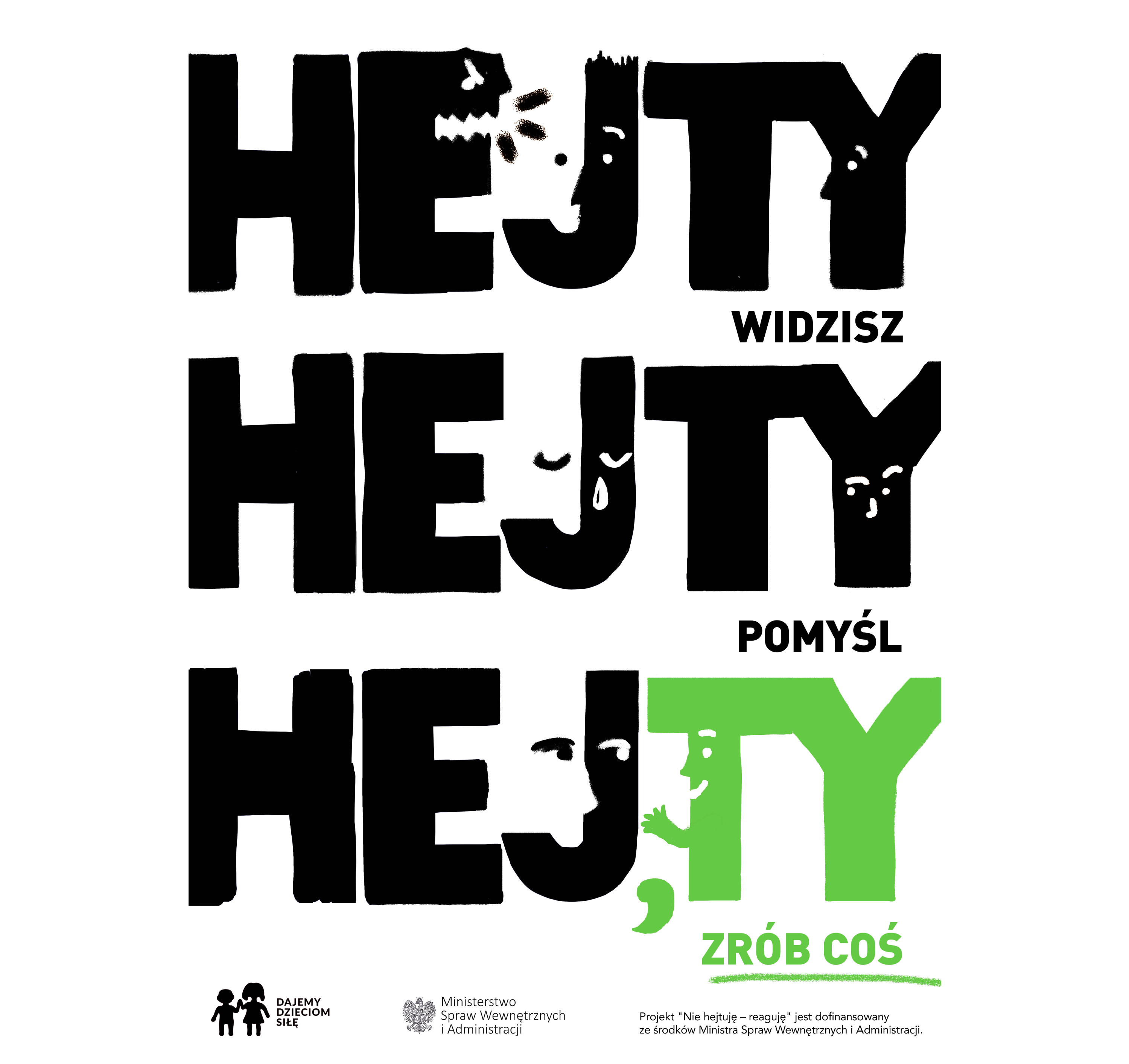 Na hasło kampanii wybrano grę słów, będącą zarazem wezwaniem do refleksji i działania: „HEJTY widzisz! HEJ, Ty pomyśl! HEJ, Ty zrób coś!”. Hasło zostało zilustrowane przez Zofię Lasocką, absolwentkę Wydziału Grafiki na warszawskiej Akademii Sztuk Pięknych.