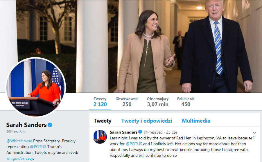 Dalej czytamy także, że dwa dni później do sprawy odniósł się na Twitterze Donald Trump. „Restauracja Red Hen powinna bardziej skupić się na czyszczeniu brudnych zadaszeń, drzwi i okien (potrzebuje prac malarskich) zamiast odmawiać obsługi tak wspaniałej osobie jak Sarah Sanders. Zawsze wyznawałem zasadę, że jeśli restauracja jest brudna na zewnątrz, jest też brudna od środka!” – napisał na Twitterze.