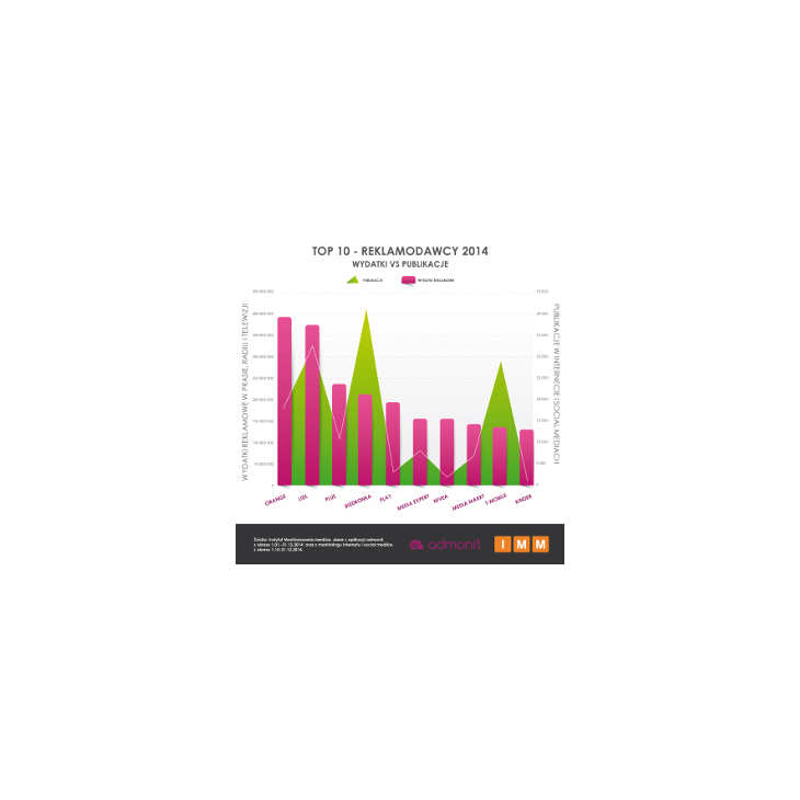 Zdecydowanymi liderami wydatków reklamowych w prasie, radiu i telewizji w 2014 byli reklamodawcy: Grupa Orange i Lidl Polska, którzy wydali na promocję swoich marek kolejno Orange: ponad 390 mln zł i Lidl: ponad 370 mln zł. Pierwszą piątkę dopełniają: Polkomtel z marką Plus, Jeronimo Martins Dystrybucja S.A. – Biedronka, P4 – Play, których wydatki plasują się w okolicy 200 mln zł z osobna w skali całego roku. Za wysokością wydatków nie idzie jednak od razu liczba emisji reklam. O ile Orange (ok. 150 tys. emisji) i Lidl (ok. 110 tys. emisji) przodują nadal także w tym zestawieniu, to jednak na trzecim miejscu znajduje się, piąty co do skali poniesionych kosztów na reklamy, Play (ok. 100 tys. emisji). Różnice te wynikają z decyzji reklamodawców, którzy wybierają więcej emisji, ale w tańszych pasmach reklamowych lub odwrotnie – mniej, ale w okresie większej słuchalności, czy oglądalności.