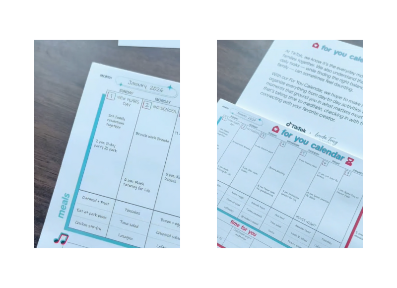 Z początkiem 2026 roku TikTok uruchomił projekt wspierający rodziny w budowaniu zdrowych nawyków cyfrowych. Platforma nawiązała współpracę z artystką Lindą Tong, właścicielką marki zajmującej się ręcznym ilustrowaniem artykułów papierniczych. Efektem tej współpracy jest powstanie kalendarza „Dla Ciebie”. To fizyczny planer tygodniowy, który ma pomagać rodzicom i nastolatkom w lepszej organizacji czasu oraz wzmacnianiu więzi rodzinnych.