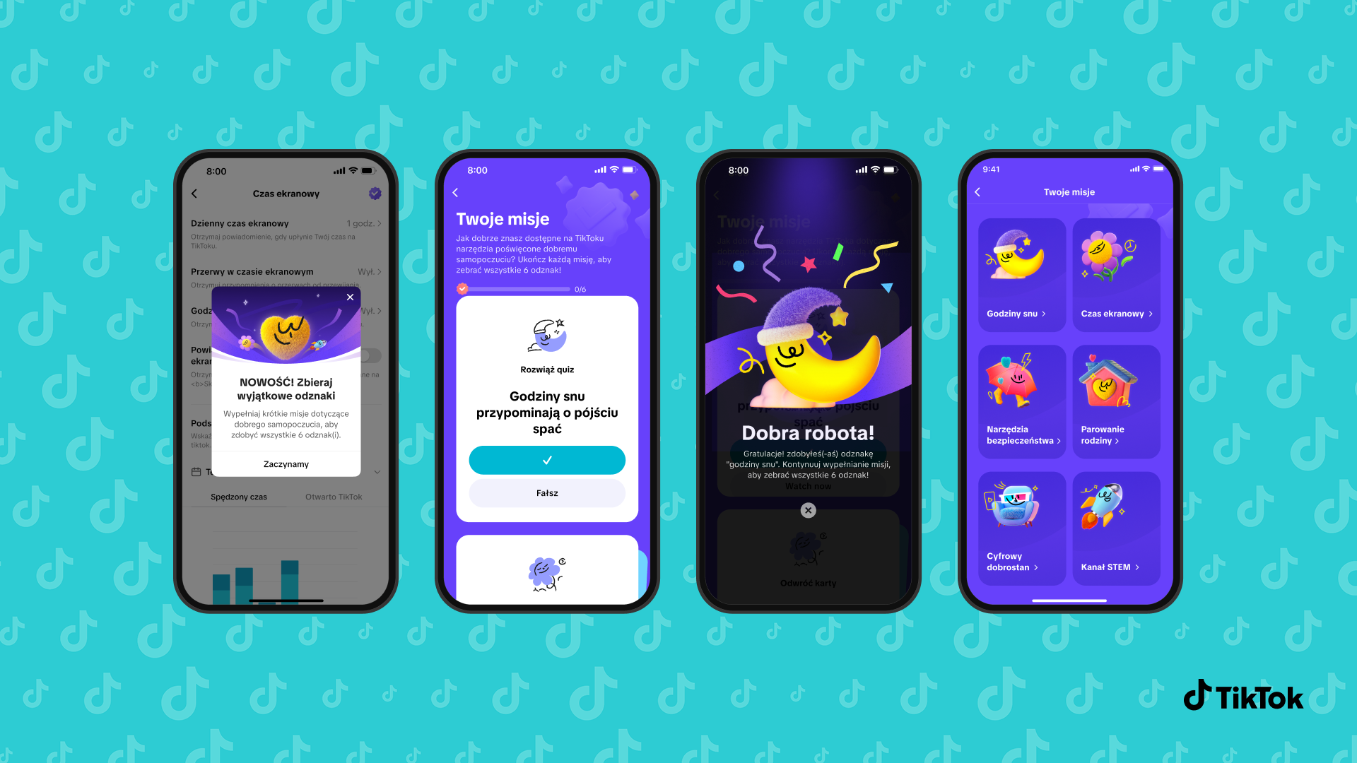 TikTok postanowił stworzyć opcję, która będzie pomocna w rozwijaniu zrównoważonych nawyków cyfrowych. Funkcja Well-being missions to seria krótkich, angażujących zadań na platformie. Wraz z ukończeniem każdego zadania użytkownicy będą otrzymywać odznaki, które edukują, zachęcają i wzmacniają pozytywne zachowania związane z higieną cyfrową. Pierwsza seria zadań koncentruje się na poznaniu dostępnych narzędzi z zakresu Digital Well-being